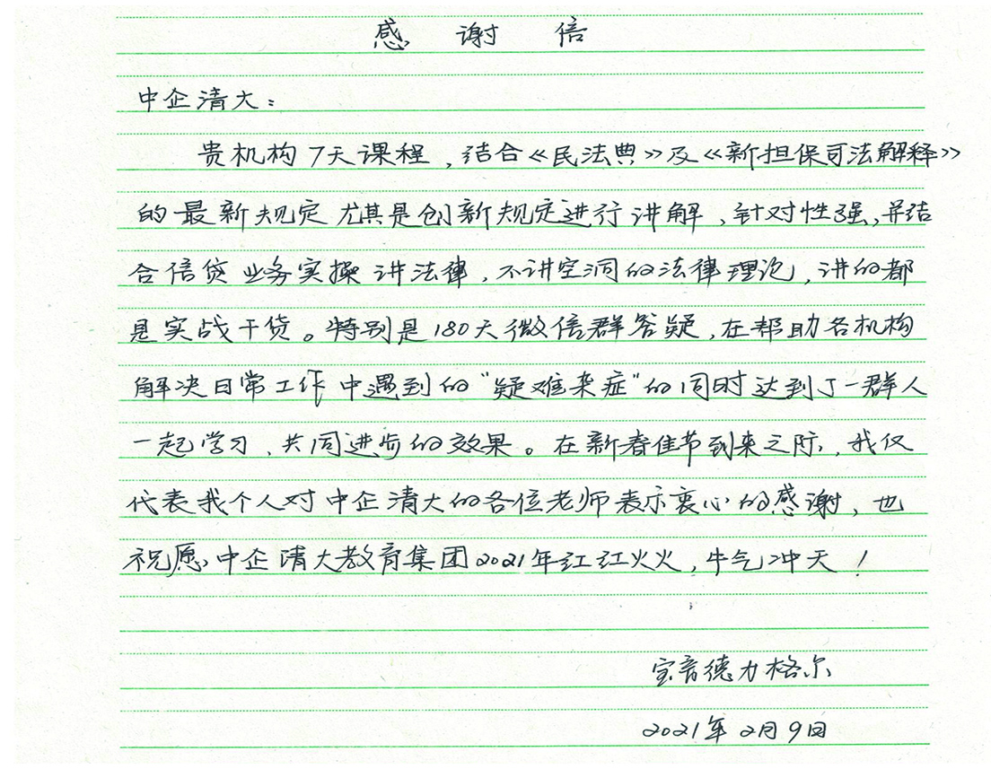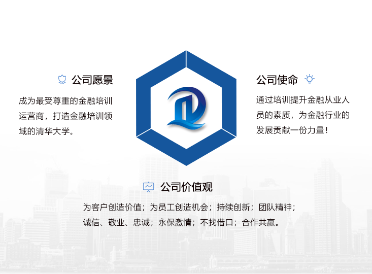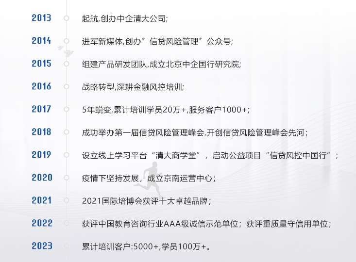中企清大金融教育集團坐落于首都北京,由薛偉先生于2013年創辦,是一家專注于為銀行、小貸公司、擔保公司等機構提供培訓和咨詢服務的金融教育培訓機構。中企清大教育集團秉承“聚焦客戶需求、堅守專業價值、致力追求卓越、與客戶共同成長”的公司使命,秉承誠信、專業、創新、分享的服務理念,勵志將中企清大打造成金融教育培訓領域的清華大學。